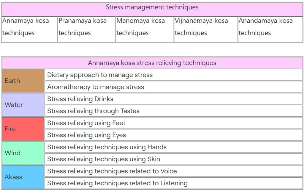 Stress-relieving techniques can be categorized based on the kosa or elements or indriyas they target.
